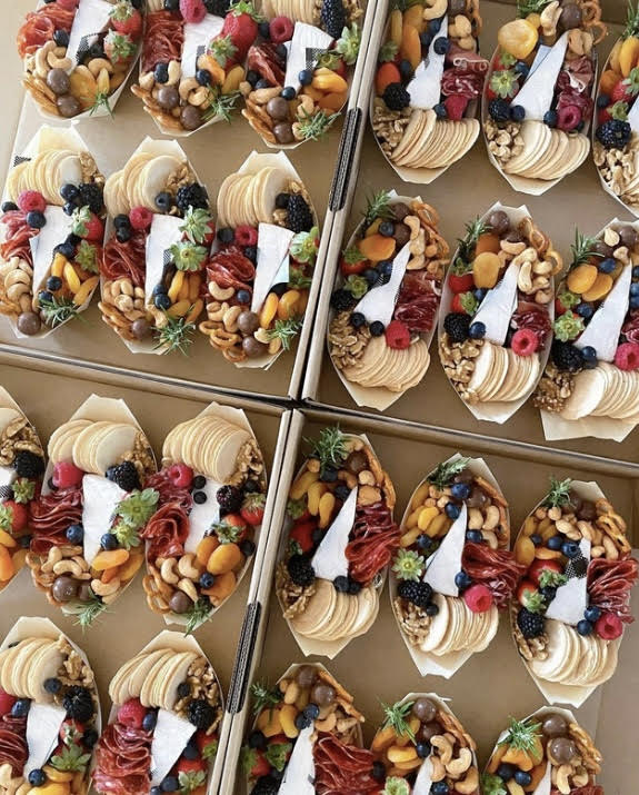 An artfully arranged individual serving featuring two types of charcuteries, two artisan cheeses, fresh fruits, premium nuts, and a crisp artisan cracker perfectly portioned for a single-serve gourmet experience.